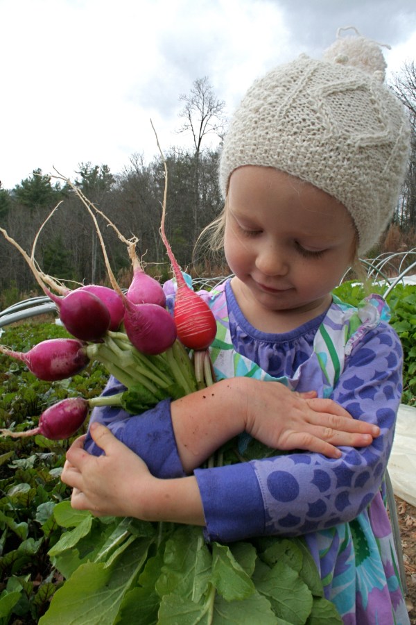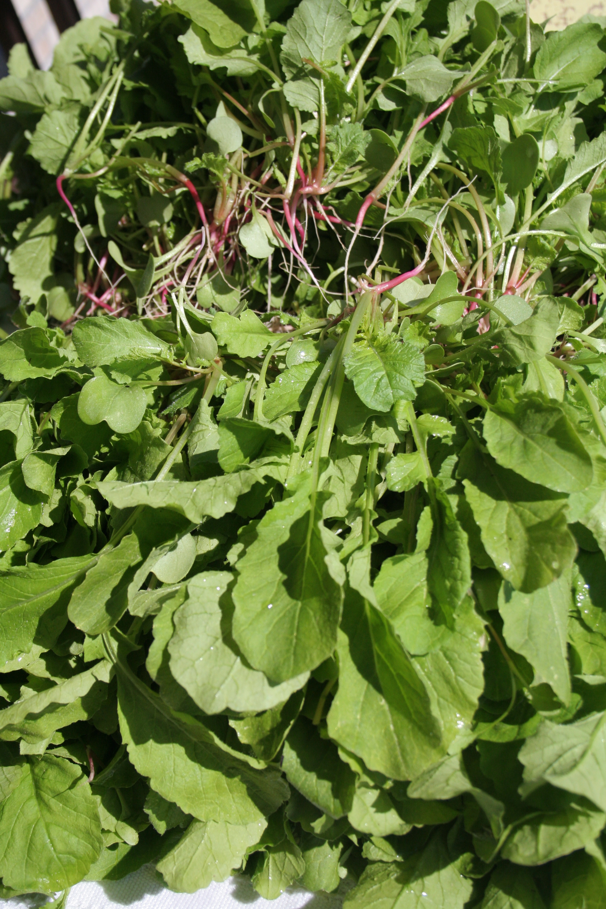 Today was Radish thinning day and we now have beautiful Radish Greens available for purchase. Radish Greens you may think… what are they good for, compost? Radish Greens can be used anyway you would use other greens… sautéed in your favorite stir fry recipe, added to green smoothies, eaten fresh in salad, or on their own. Our favorite way to eat Radish Greens is in Radish Top Soup or raw from the garden. Althea has been picking at them for days now.